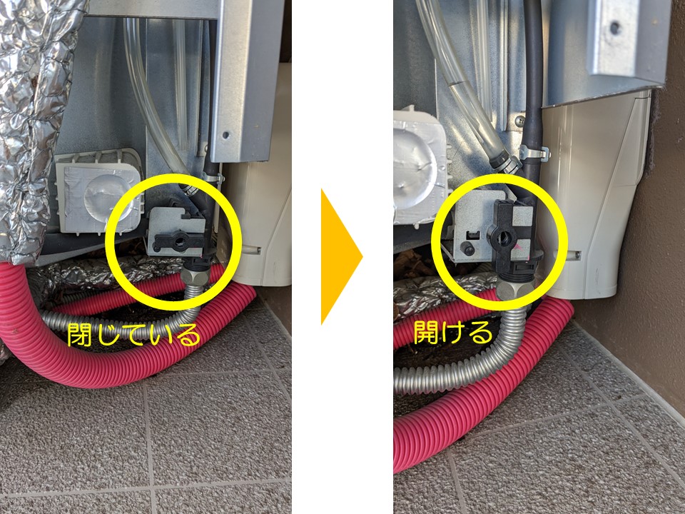 続いて「給水止水栓」を画像左から右のように、90度回して閉めてください。我が家の機種は、回す方向の矢印が書いてありました。