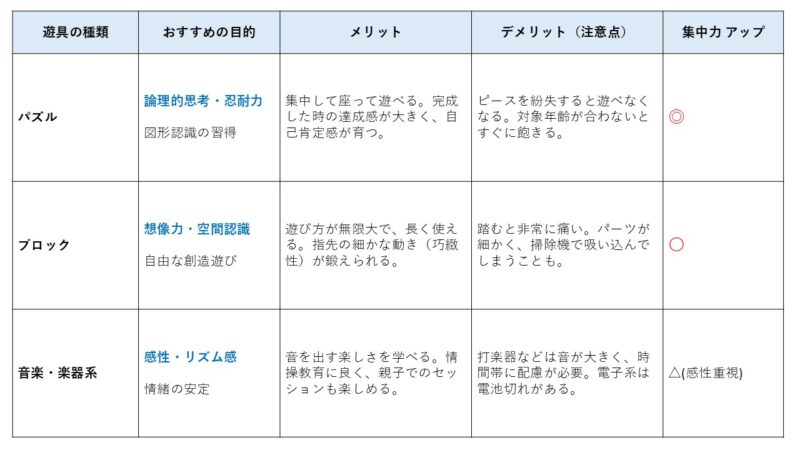 子どもの知性を育むためには、知育おもちゃが非常に効果的です。知育おもちゃは、遊びながら考える力や集中力を養い、自然に学ぶ姿勢を形成します。また、モンテッソーリ教育の思想を取り入れたおもちゃは、自主的な学びを促進するだけでなく、子どもの好奇心を刺激します。ここでは大きく3つの種類をご紹介します。