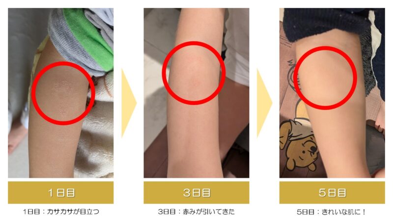 その経過がこちら。個人差はあるかと思いますので、参考程度にご覧ください。大体3日目には目立たなくなる程にカサカサが無くなり、5日目には綺麗な状態になりました!