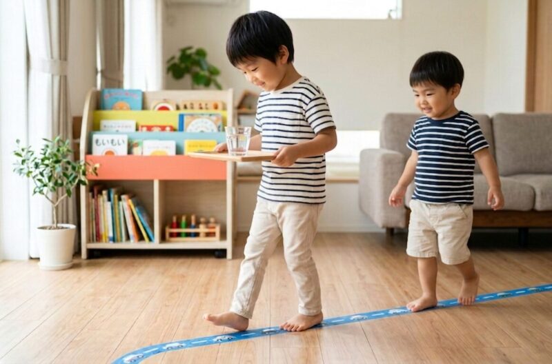 元モンテッソーリ幼稚園教諭の私が自信を持っておすすめするのが「線上歩行」です! 準備はマスキングテープ一本だけ。特別な道具がなくても、子どもが夢中になって体幹と集中力を鍛えられる、魔法のようなお仕事なんです。我が家の子どもたちも、これで驚くほど静かに集中するようになりました